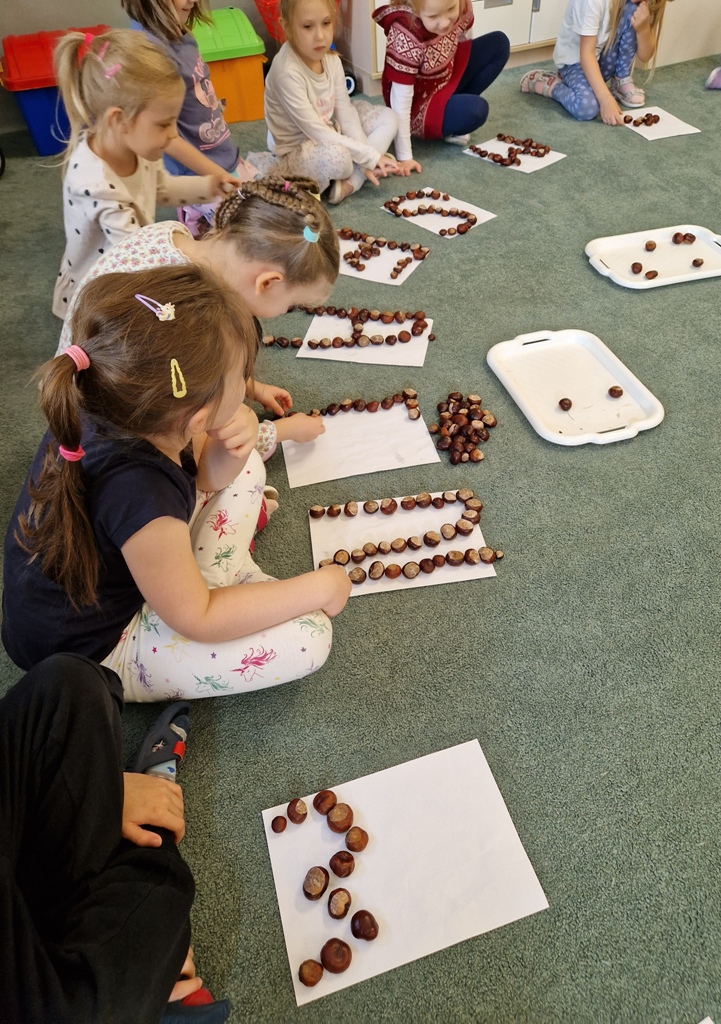 3 października Sówki obchodziły Dzień Kasztana obchodzony jest to nieformalne święto jesieni, które celebruje zbieranie kasztanów, spacery po parku i kreatywne zabawy z wykorzystaniem tych owoców, takie jak tworzenie ludzików, zwierzątek czy jesiennych dekoracji.Dzieci wykonywały różne zadania językowe i matematyczne: rozwiązywały jesienne zagadki, układały jesienne rytmy, rozpoznawały jesienne skarby za pomocą dotyku, dopasowywały je do odpowiednich nazw. Ponadto uczestniczyły w zabawach ruchowych do jesiennych utworów: "Skaczące kasztany", "Zapasy wiewiórki". Rozwiązywały matematyczne zadania z kasztanami i żołędziami, układały wybrane figury geometryczne, segregowały i tworzyły zbiory.